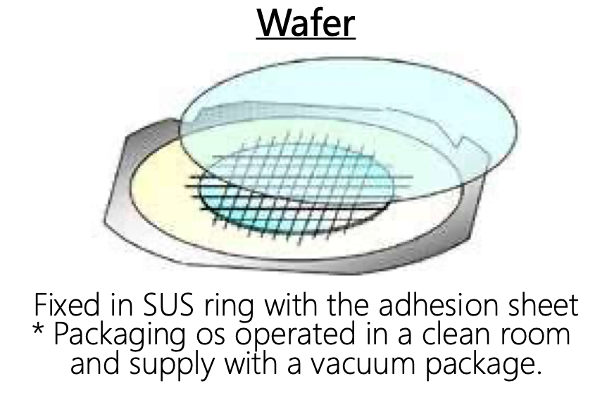 Fixed in SUS ring with the adhesion sheet * Packaging os operated in a clean room and supply with a vacuum package.